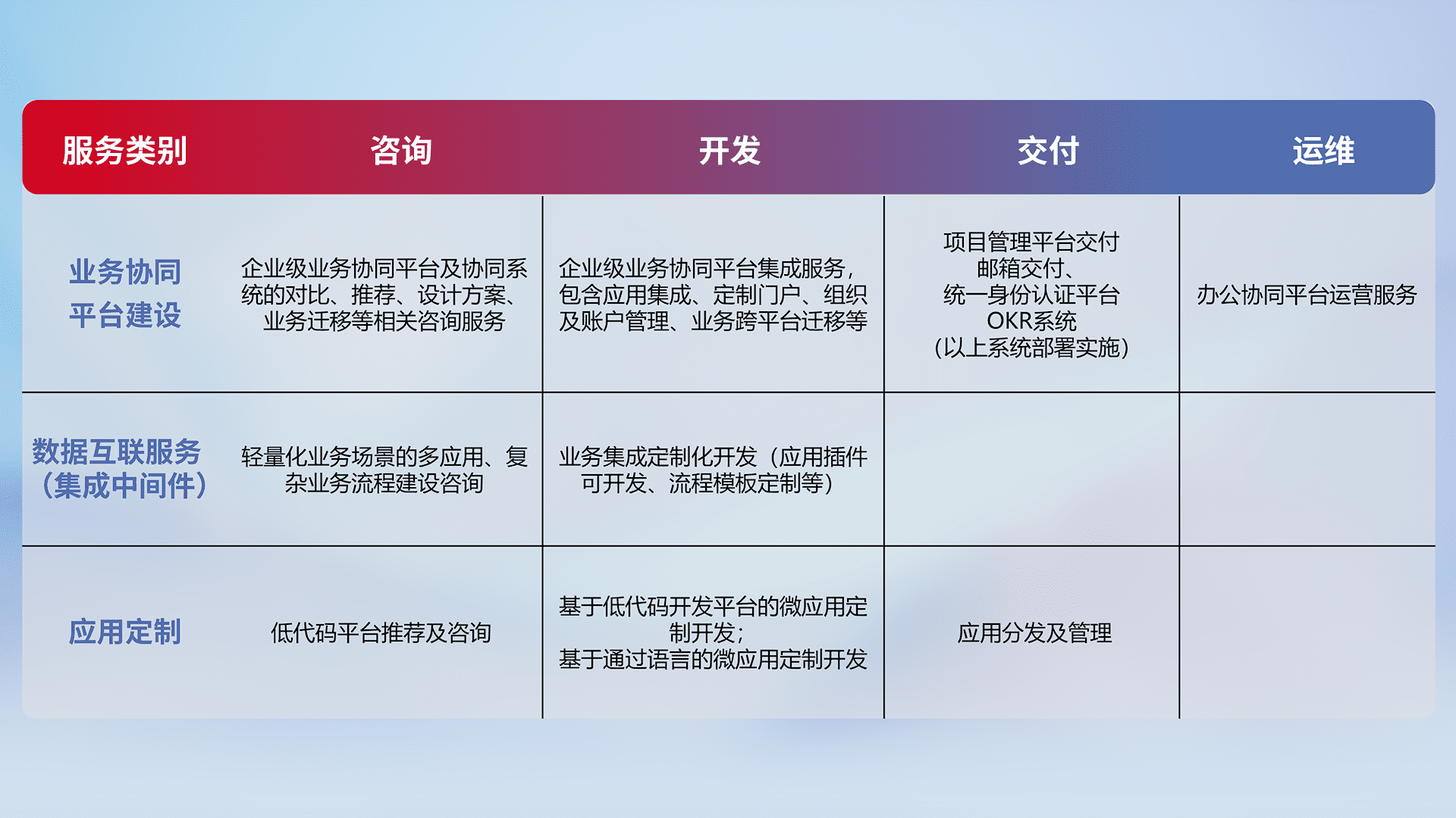 针对钉钉、、、、企微、、、IDaas等平台级产品提供产品的规划、、、、方案、、、、交付、、、定制化开发等服务,,,实现如统一协同办公、、、、智能客户服务、、、混合会议管理、、智能数据查询、、、等业务场景,,实现数字化转型。。。。