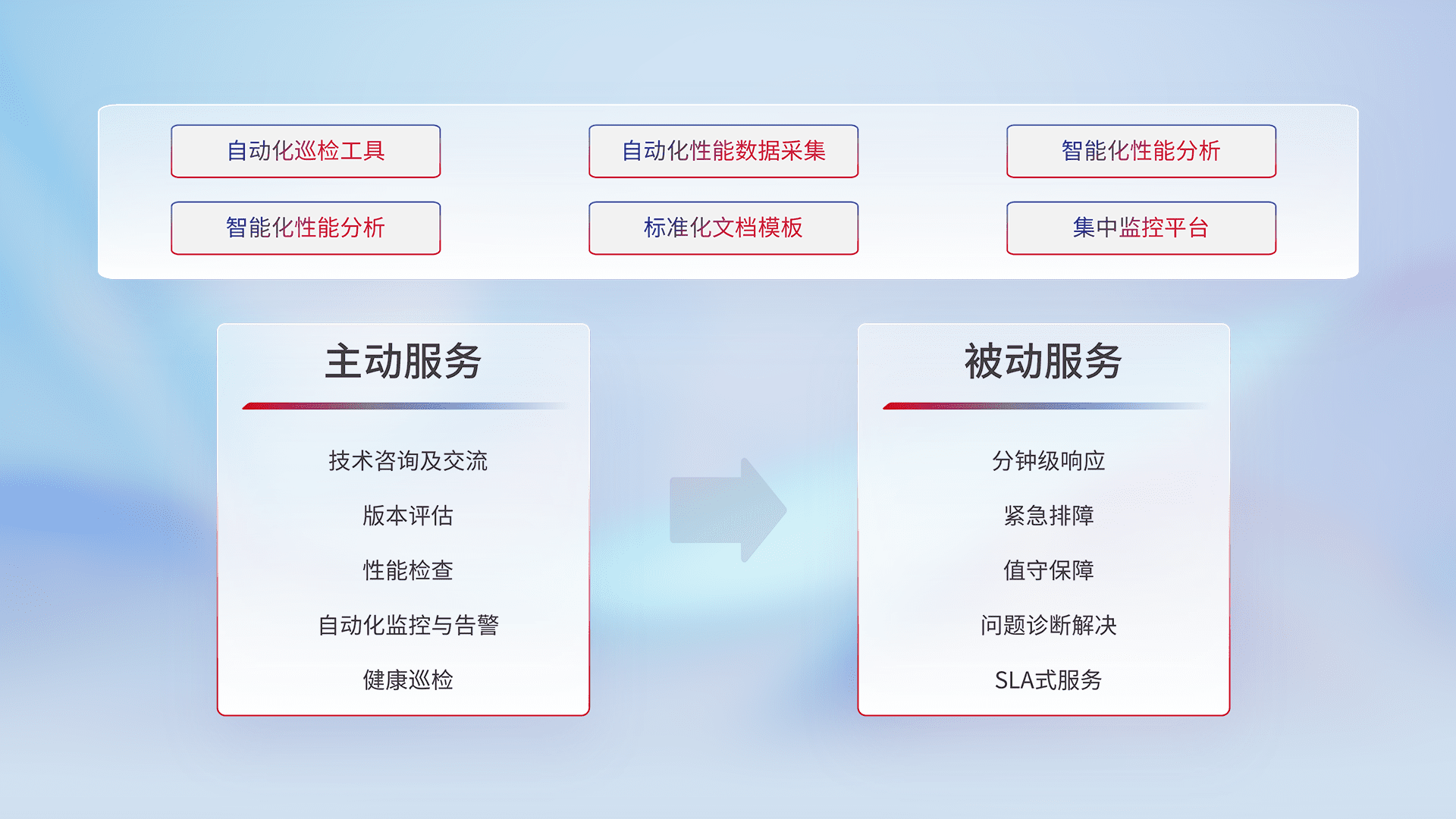 智能化工具和标准化文档,,保障服务质量,,提供主动服务(包含技术咨询、、版本评估、、、性能检查、、自动化监控与告警、、、、健康巡检)和被动服务包含(分钟级响应、、、紧急排障、、值守保障、、问题诊断解决、、、SLA服务)。。。。